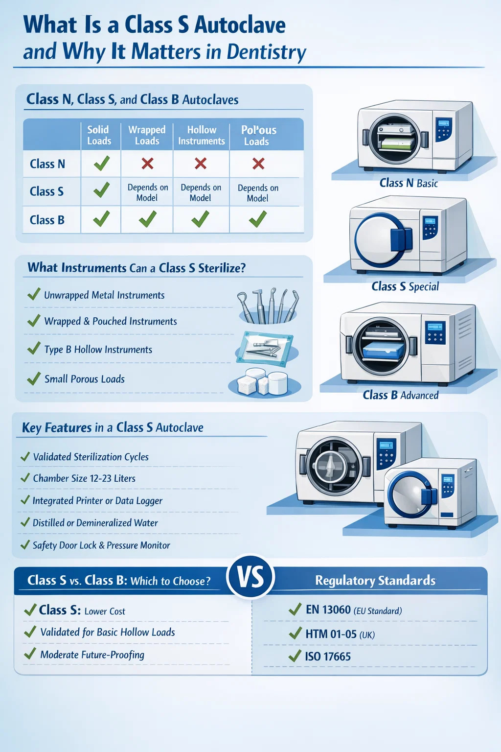 Đối với hầu hết các phòng khám nha khoa, câu hỏi quan trọng là liệu nồi hấp nha khoa Loại S có thể xử lý đầy đủ các dụng cụ được sử dụng hay không - từ dụng cụ kim loại rắn đến tay khoan rỗng, túi đóng gói và tải được bọc xốp. Câu trả lời phụ thuộc vào các chu kỳ phụ cụ thể mà nhà sản xuất đã xác nhận cho máy đó, đó chính xác là điều khiến Loại S trở thành một danh mục có nhiều sắc thái hơn là một tiêu chuẩn cố định.