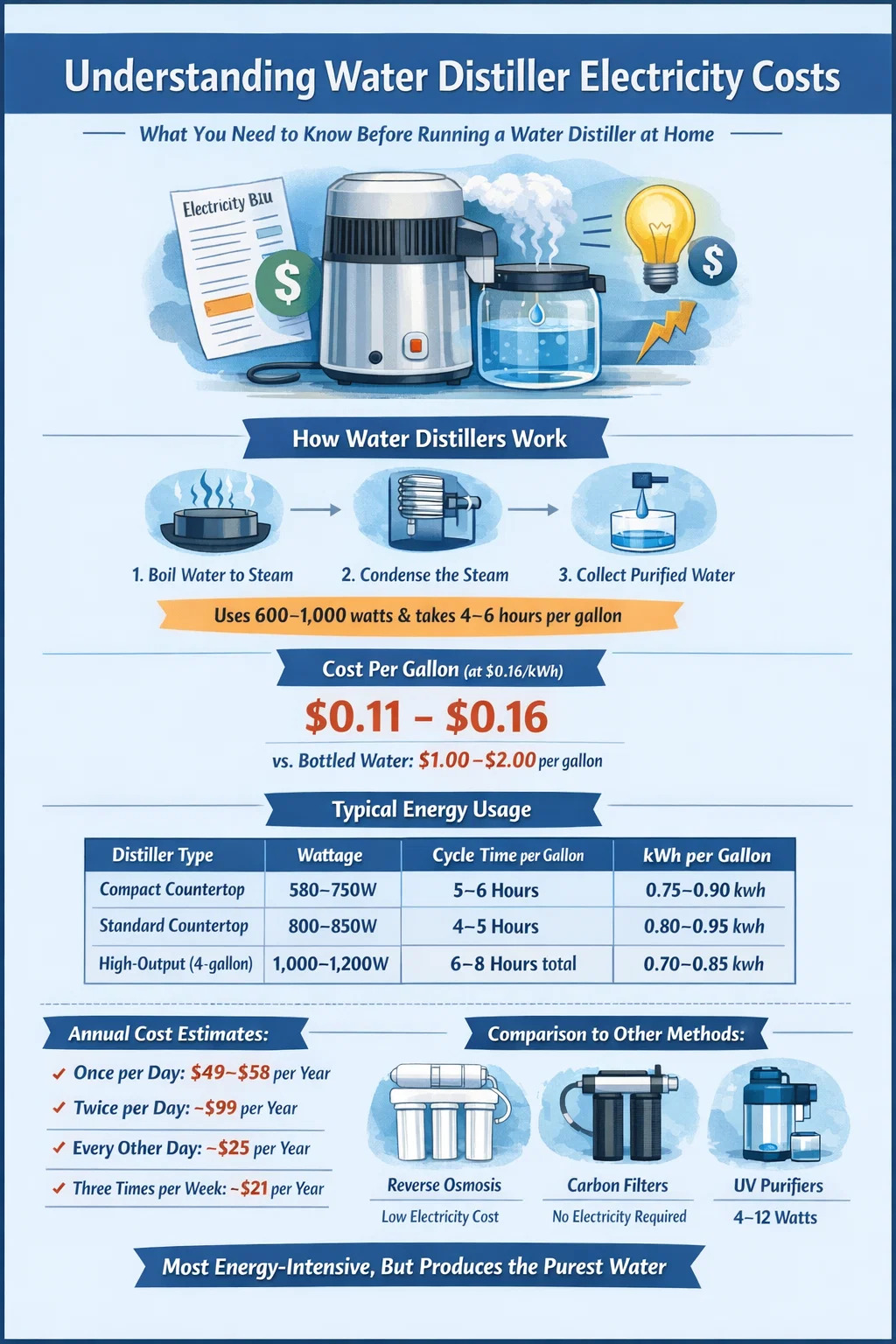 Ngay cả khi sử dụng tối đa hàng ngày, chi phí điện hàng năm cho máy chưng cất nước tại nhà vẫn là dưới 100 đô la cho hầu hết các hộ gia đình Mỹ. Cư dân ở các bang có giá điện cao hơn – giá điện trung bình ở California khoảng 0,27 USD/kWh, Hawaii gần với 0,39 USD/kWh – sẽ phải trả nhiều hơn đáng kể. Một hộ gia đình ở California chạy máy chưng cất một lần mỗi ngày sẽ chi tiêu gần hơn $83 mỗi năm chỉ về điện cho thiết bị đó.