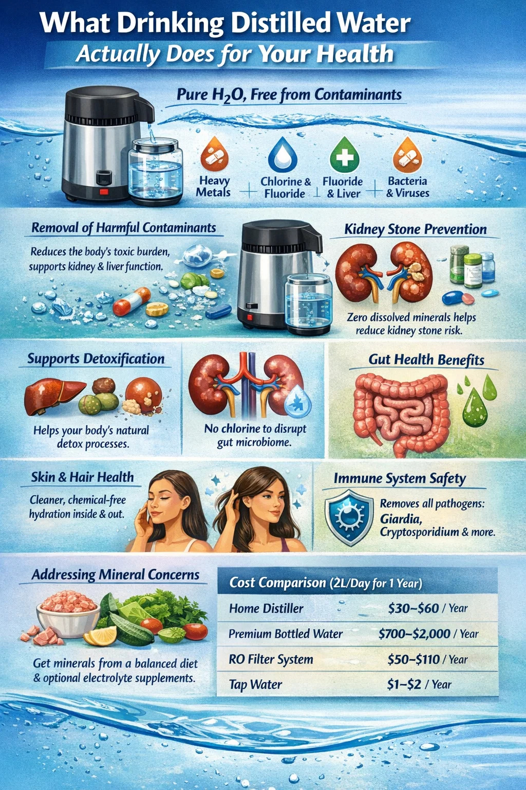 Lợi ích sức khỏe của việc uống nước cất là có thật, nhưng chúng chủ yếu là lợi ích của việc không có nước cất - không có chất gây ô nhiễm, mầm bệnh, khoáng chất không mong muốn và các chất phụ gia hóa học. Đây không phải là chuyện nhỏ. Cho rằng một người bình thường tiêu thụ khoảng 700–1.000 lít nước mỗi năm , sự khác biệt tích lũy giữa nước sạch liên tục và nước bị ô nhiễm trong suốt cuộc đời là rất đáng kể.