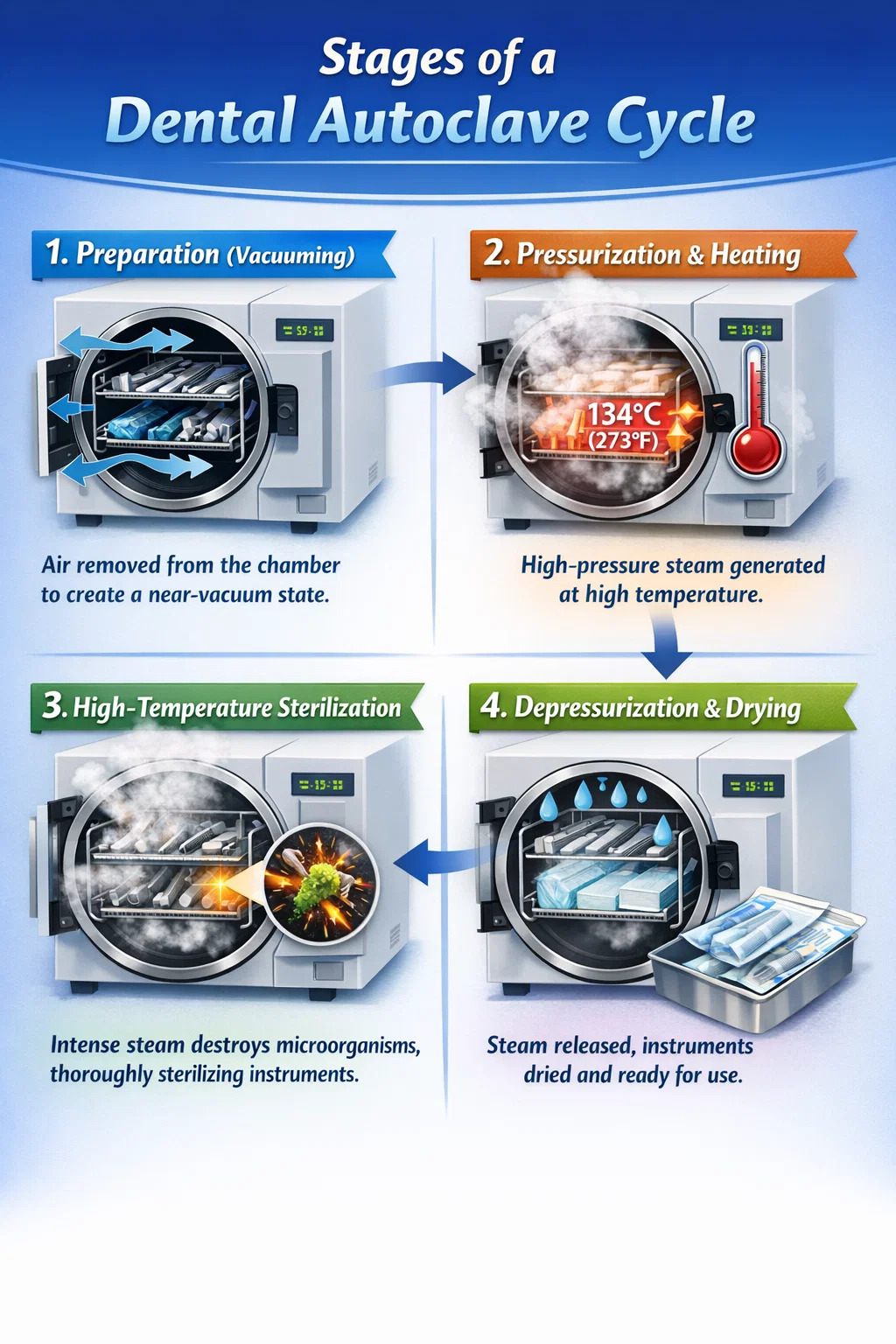 Chức năng sấy khô: Để ngăn ngừa ô nhiễm thứ cấp do dụng cụ ướt gây ra khi tháo ra, nhiều nồi hấp nha khoa kích hoạt lại bơm chân không để loại bỏ hơi ẩm còn sót lại. Làm mát và loại bỏ: Cuối cùng, áp suất bên trong buồng trở lại mức như bên ngoài và khi nhiệt độ giảm nhẹ, các bác sĩ có thể lấy các gói dụng cụ khô, sạch ra.