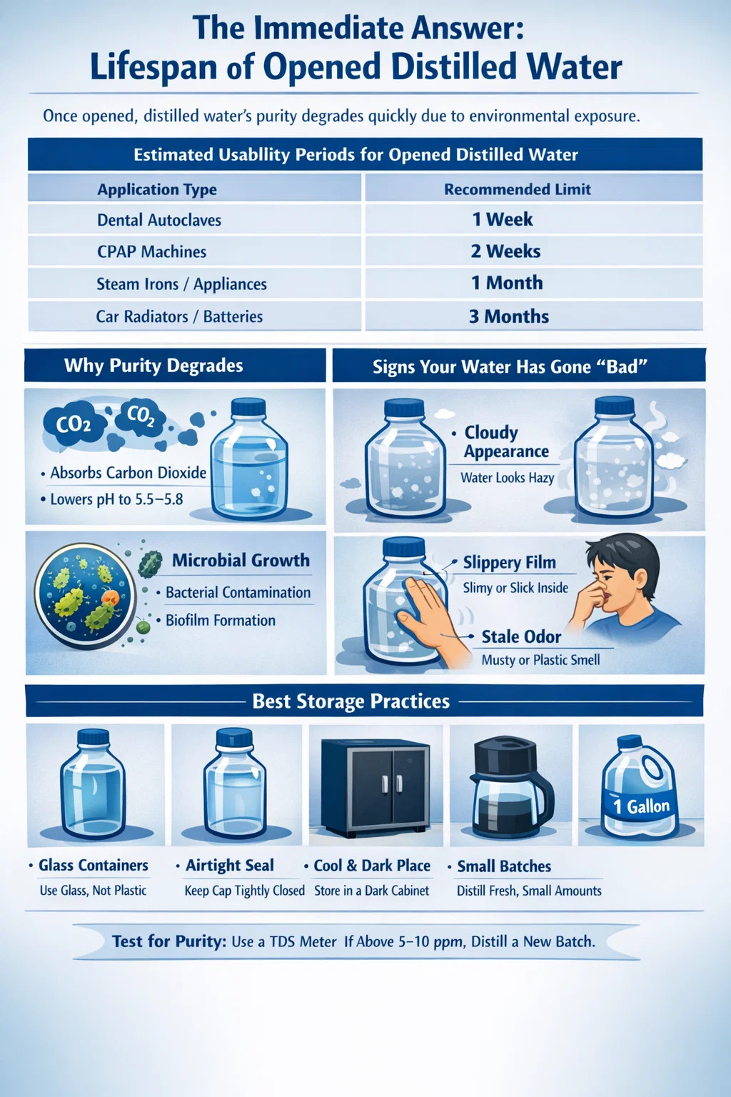 “Thời hạn sử dụng” của nước cất đã mở nắp phụ thuộc rất nhiều vào việc bạn định làm gì với nó. Yêu cầu về độ tinh khiết đối với ắc quy ô tô rất khác so với yêu cầu của trung tâm phẫu thuật nha khoa.