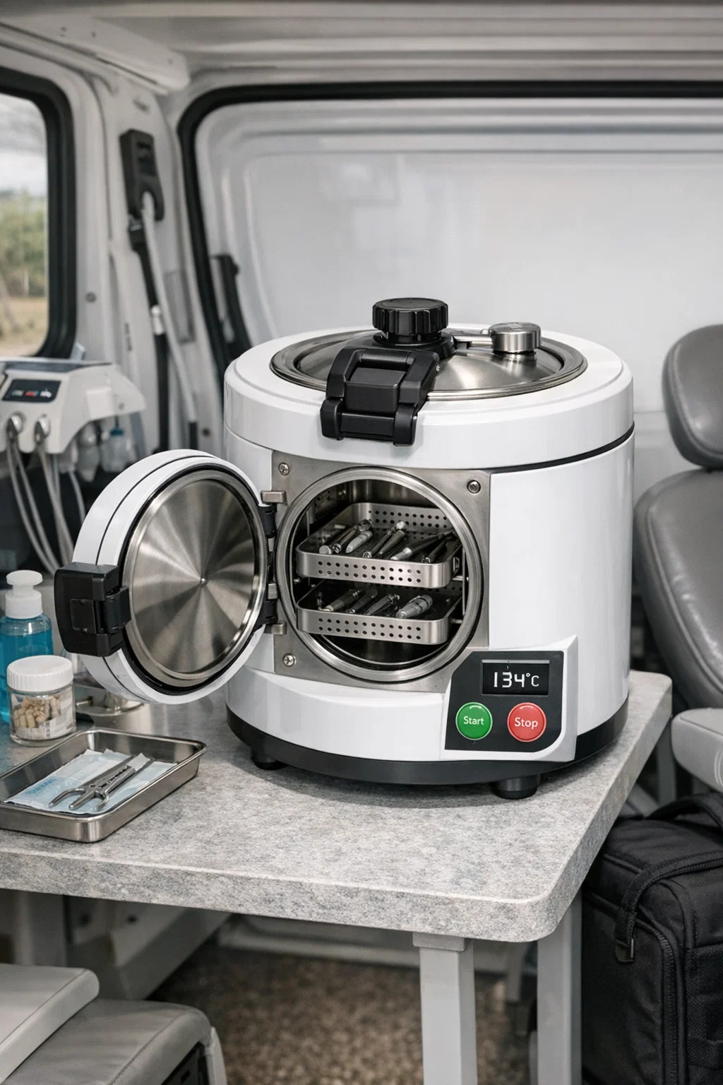 Tính linh hoạt: Đối với các phòng khám tư nhân nhỏ hoặc môi trường có không gian điều trị rất hạn chế, nồi hấp nha khoa di động giải quyết hoàn hảo vấn đề không đủ không gian.