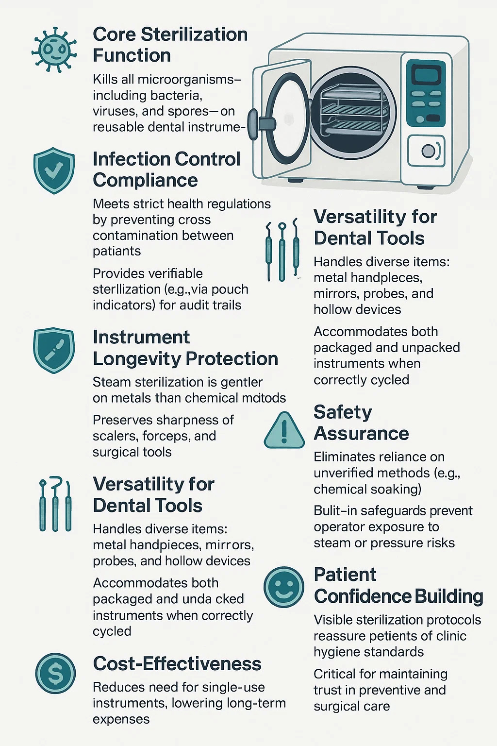| Ứng dụng đa năng | Xử lý các dụng cụ rắn, rỗng và đóng gói | Thích ứng với các loại dụng cụ và quy trình nha khoa đa dạng |