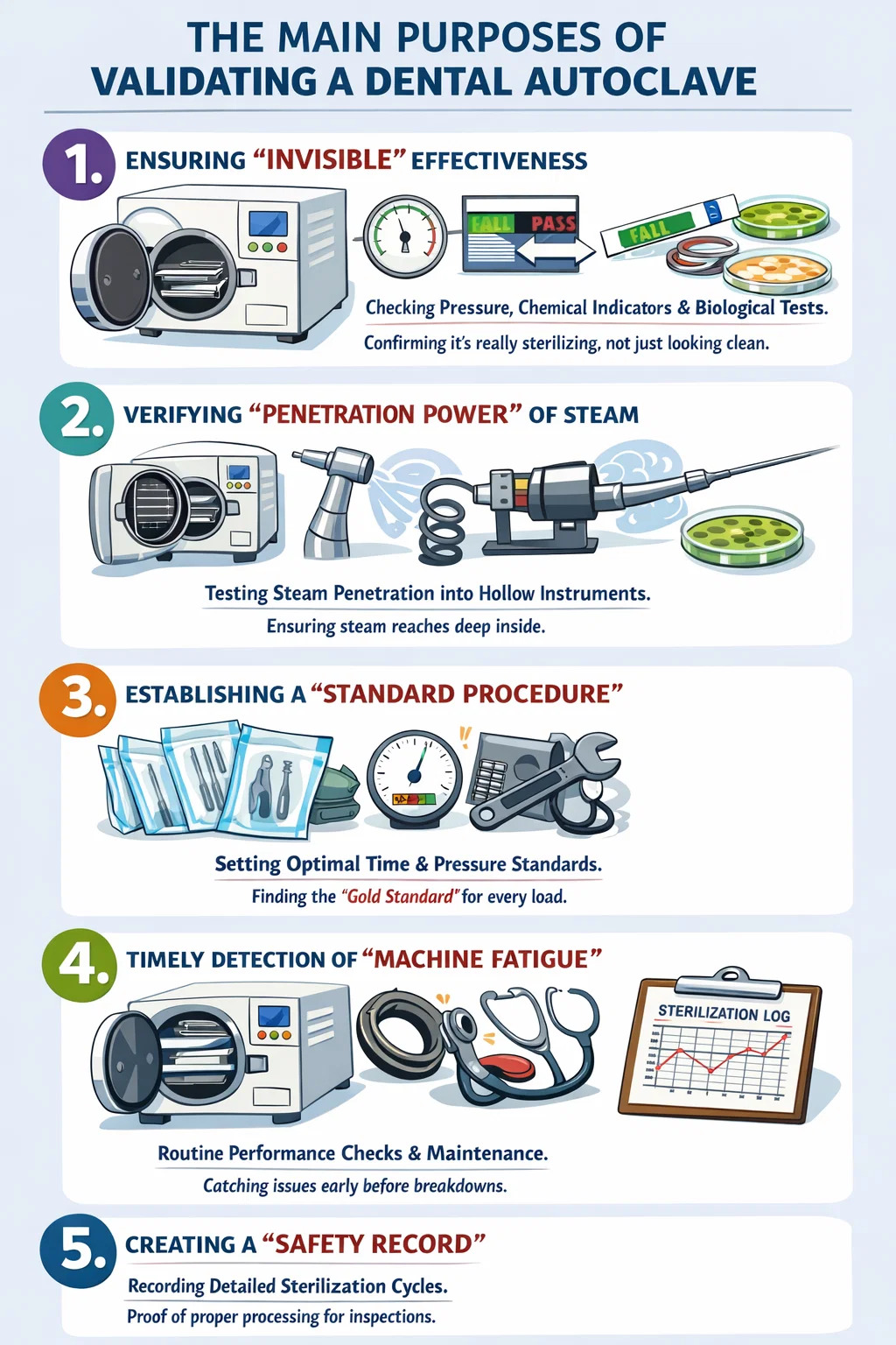 Mục đích của việc xác nhận: Thông qua việc kiểm tra hiệu suất thường xuyên, các vấn đề nhỏ có thể được phát hiện trước khi máy bị hỏng hoàn toàn hoặc quá trình khử trùng không thành công.